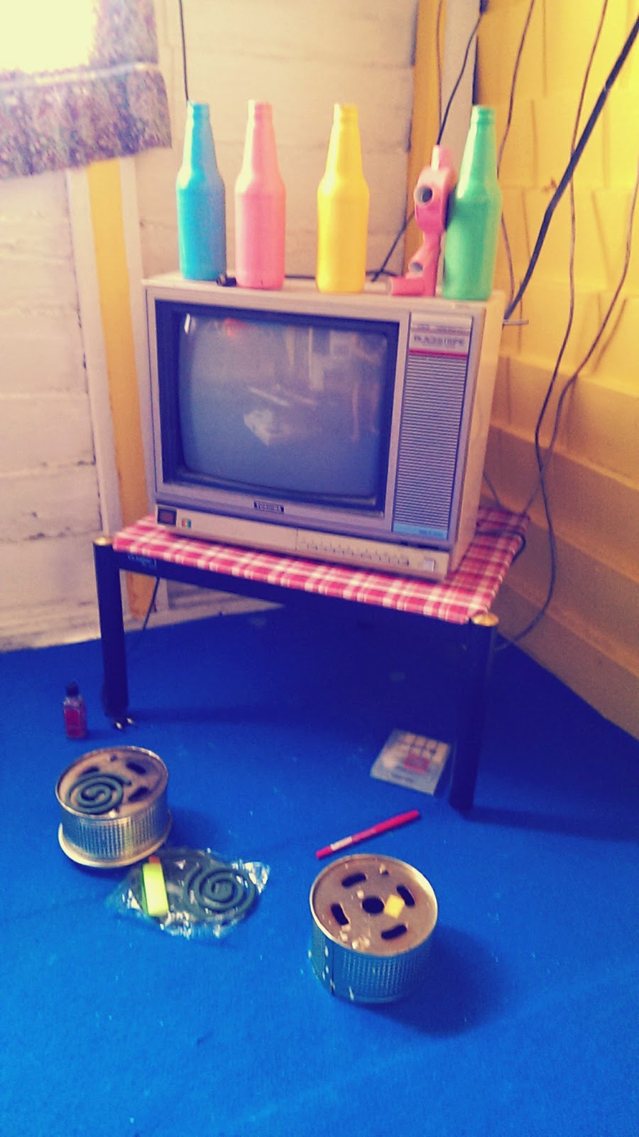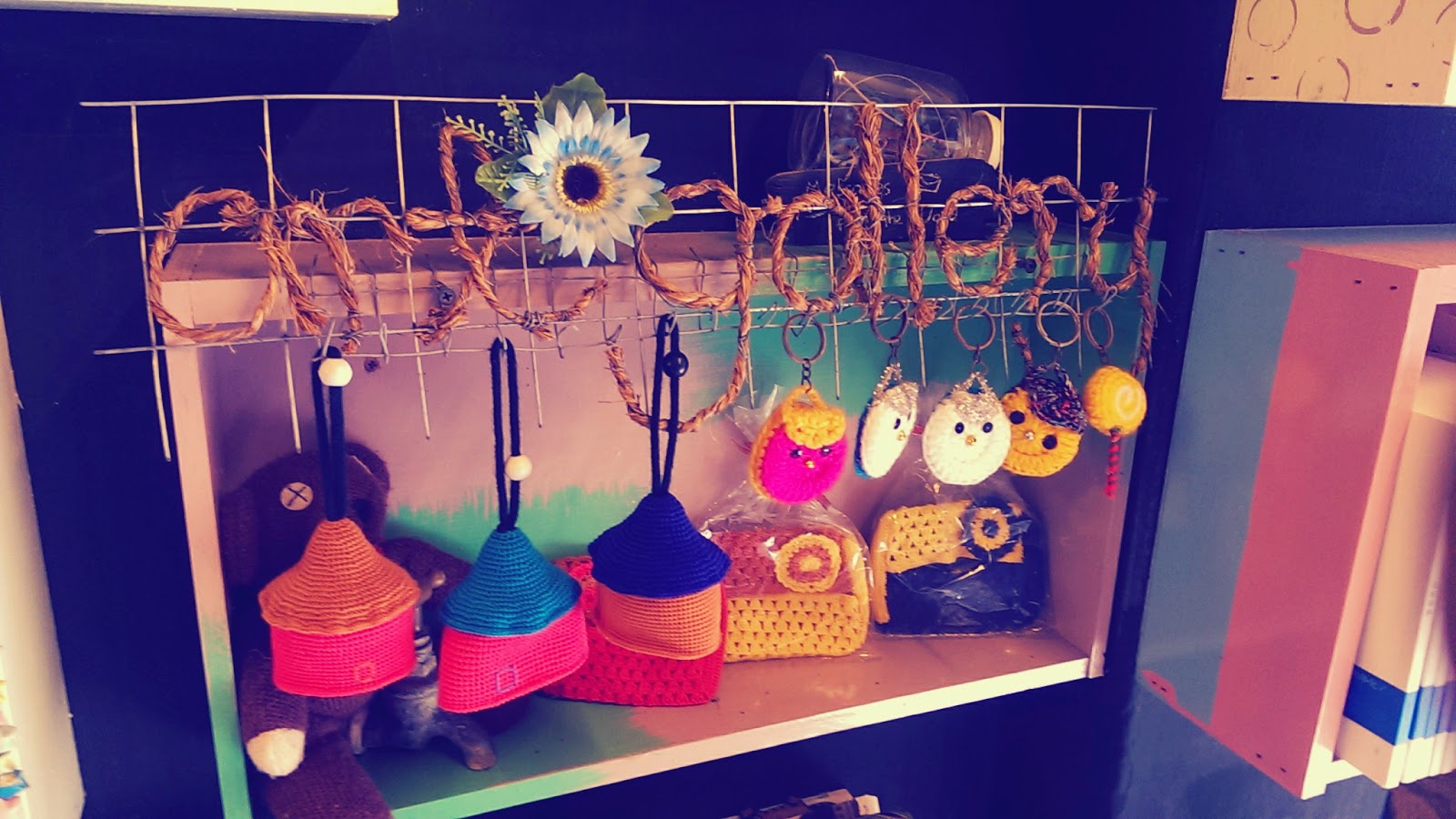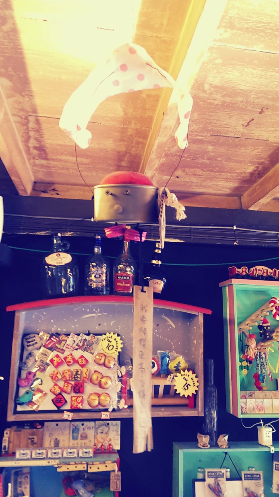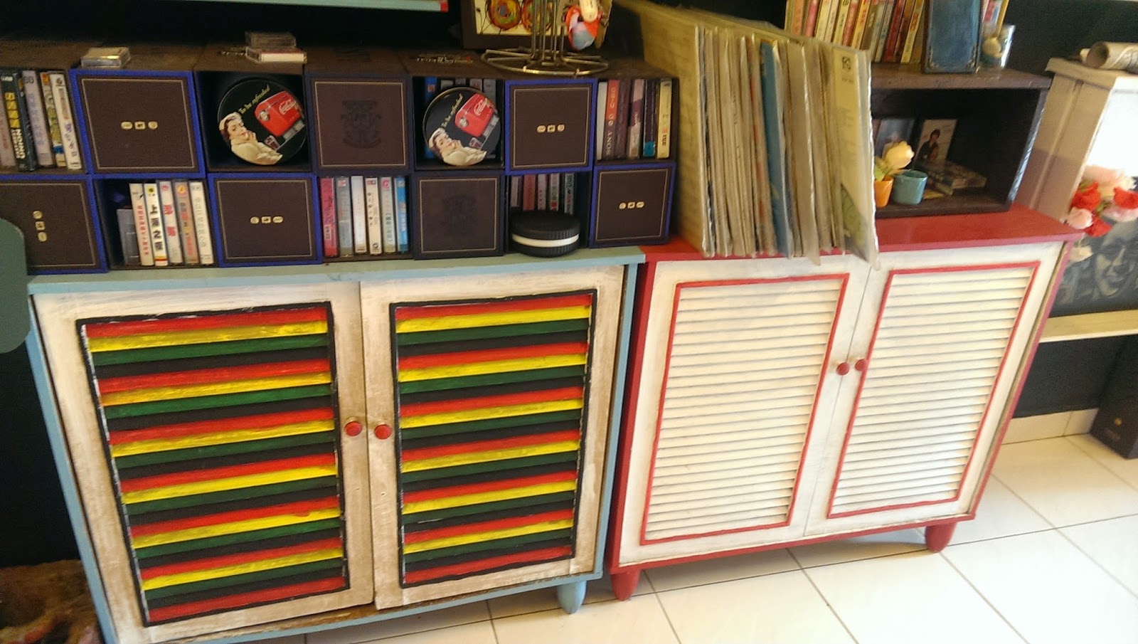 走廊右側是滿滿他們創作的記念品之外,還有我們兒時回憶的舊卡帶及黑膠片.他們很環保的利用舊抽屜重新粉刷,來當作展示櫃.而且它們的不規則反而讓這個空間更加有藝術性.