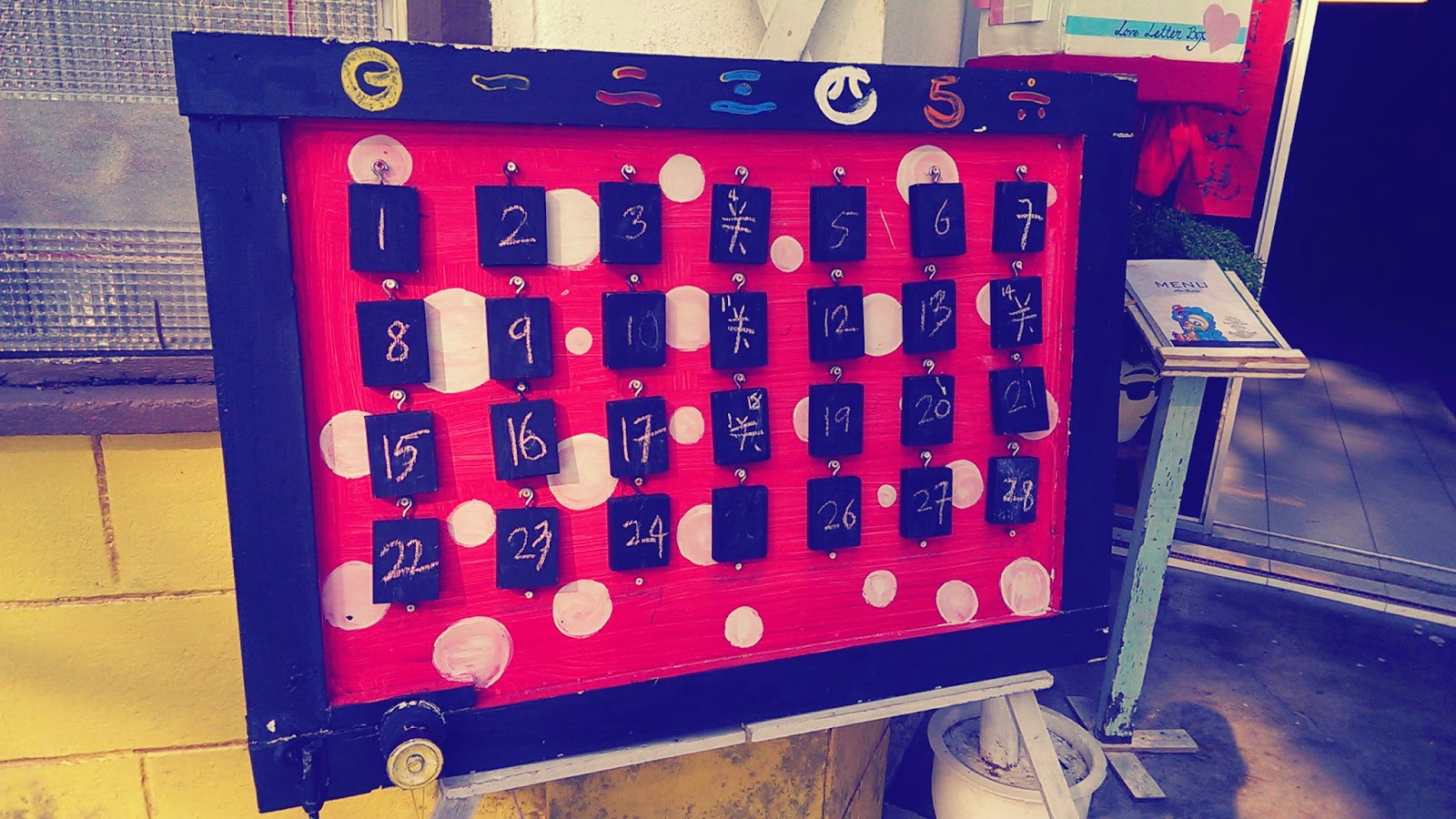 | 自己設計的開店行事曆,是由舊門重新,日子都由是小木頭組成,可以按照每月調整日期,翻過來就是公休字眼. |