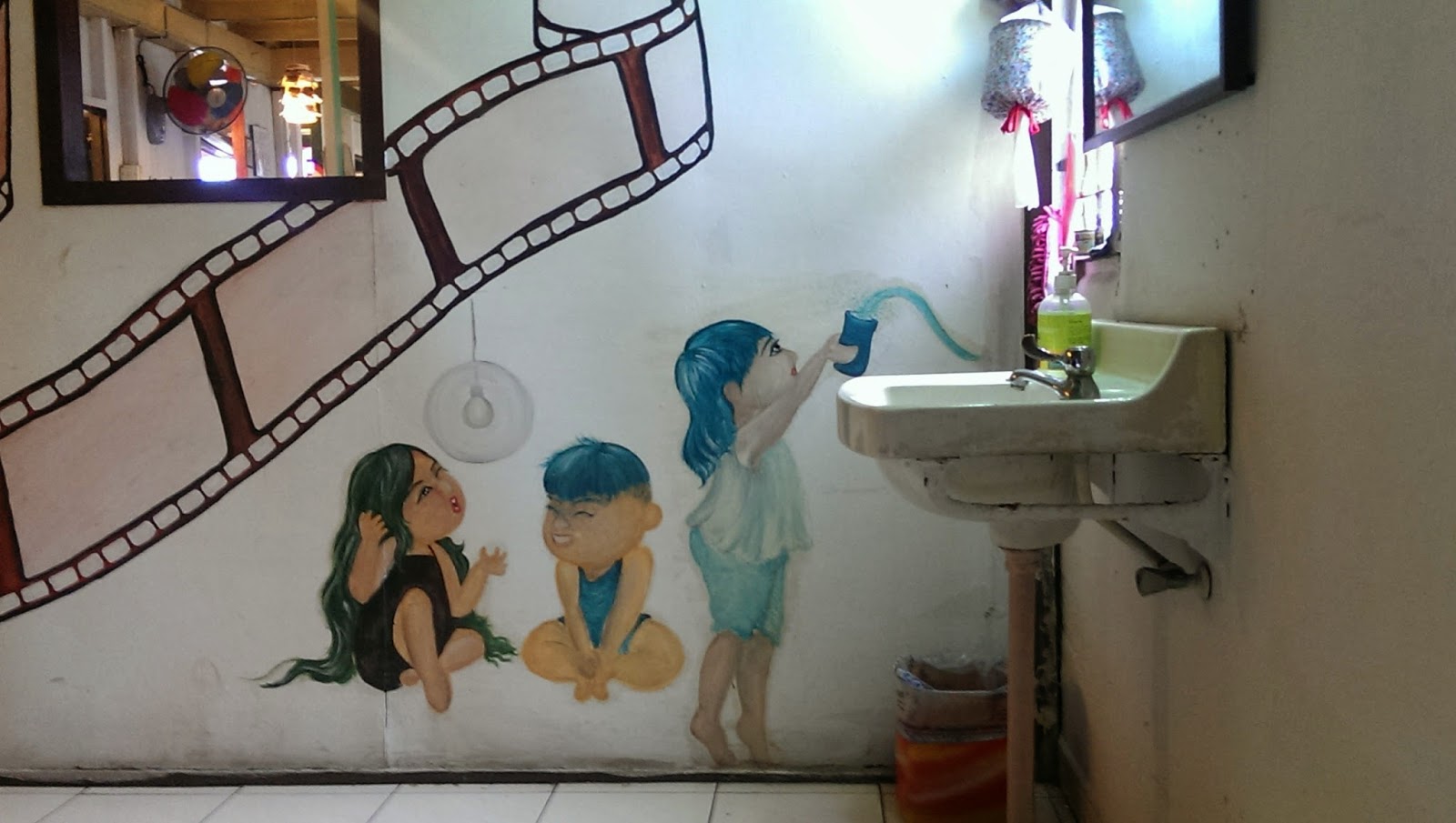 | 他們連洗手台也用了巧思,用壁畫來展現小孩子的裝水的童趣模樣 |