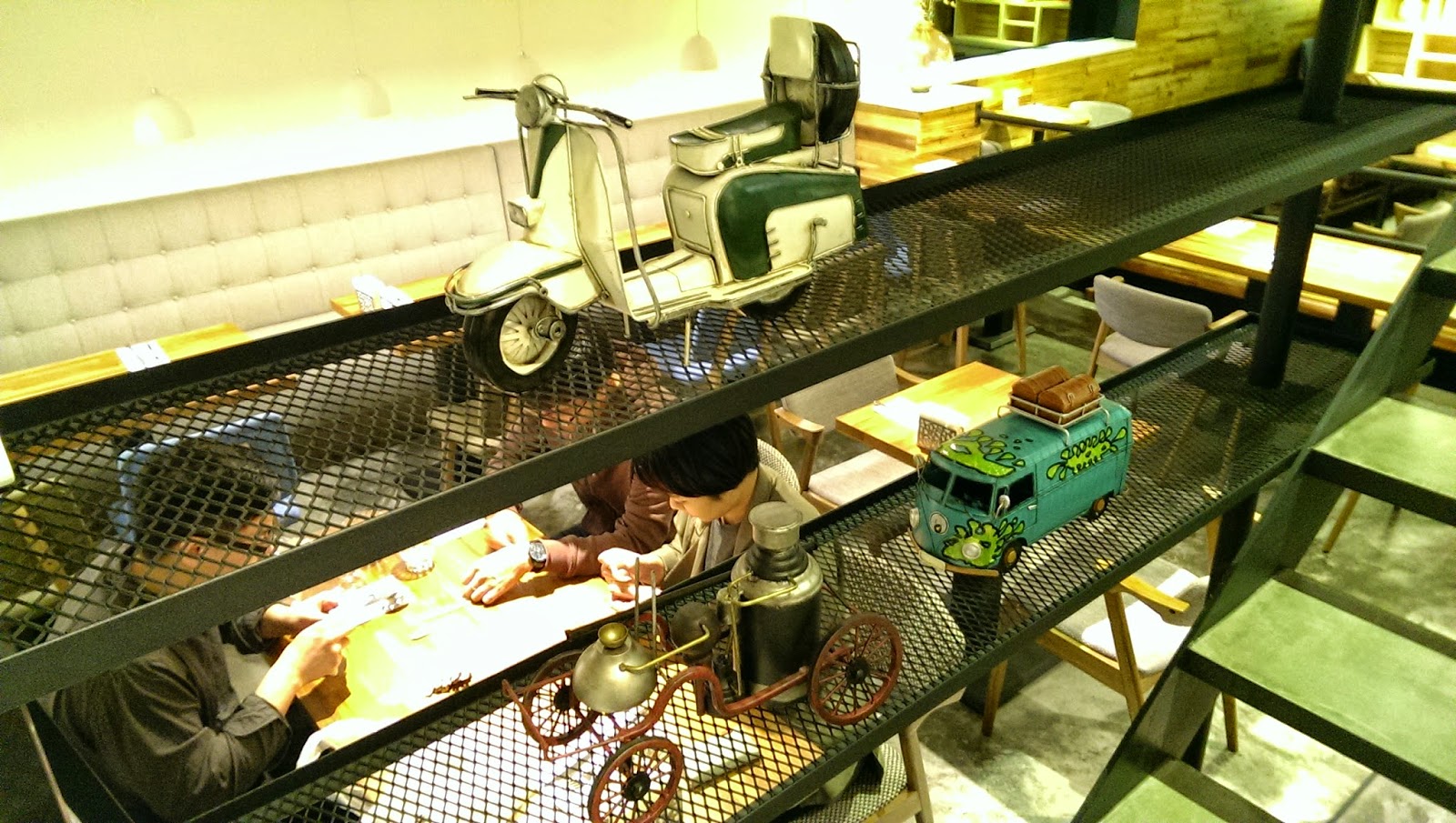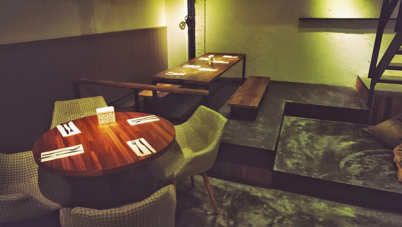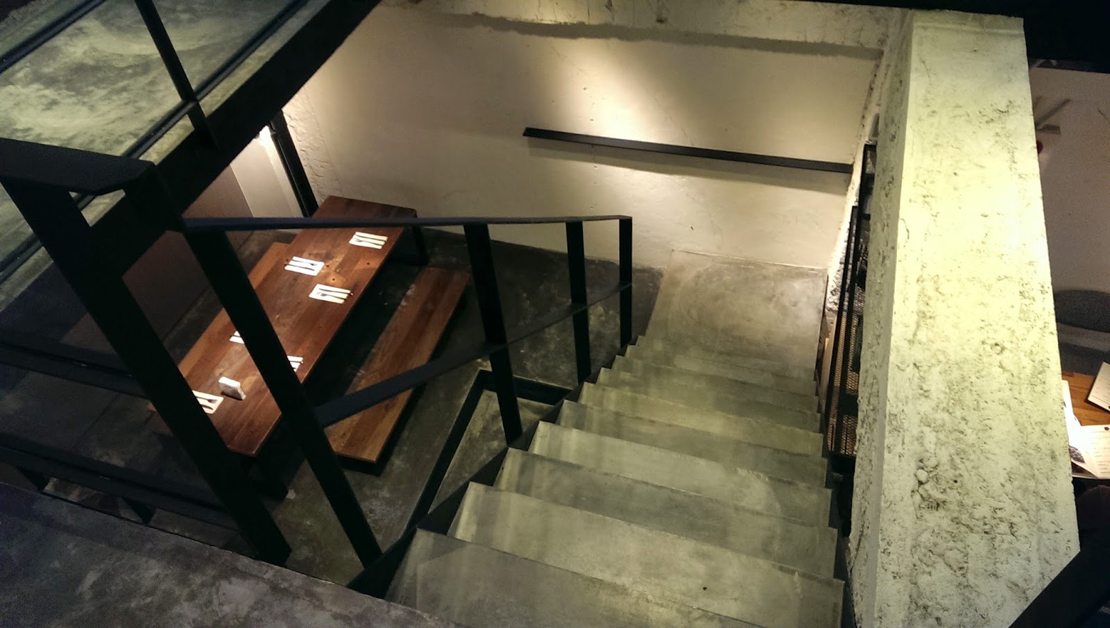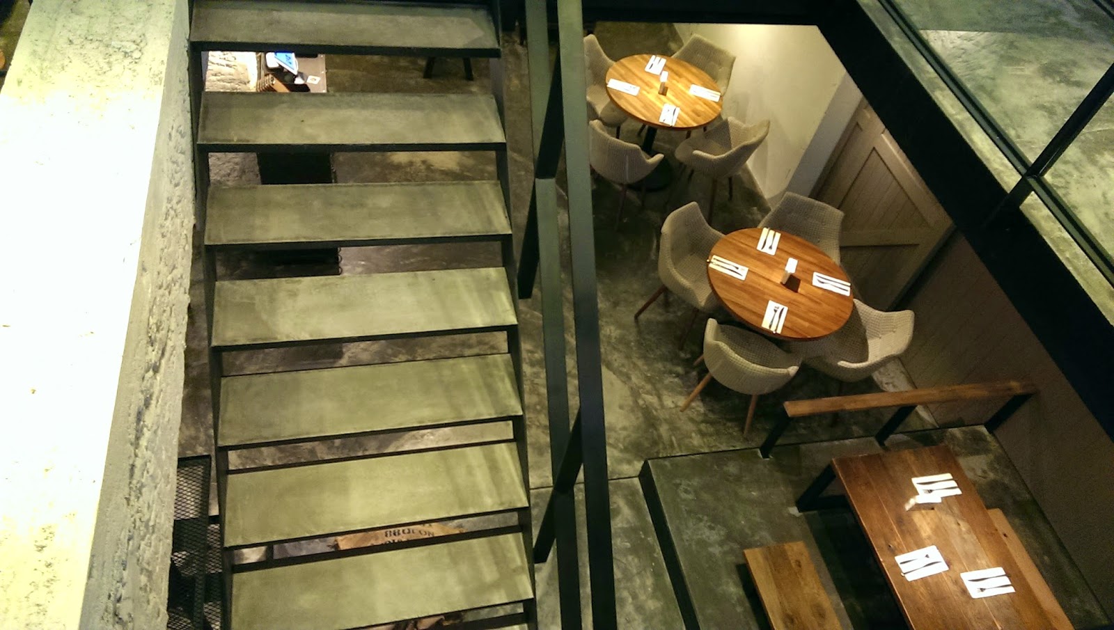 ▲▼ 這間餐廳正中間會發現一很寬敞樓梯,這裡原本應該是住家空間,應該不會有樓梯向下.設計者故意打掉地面,再利用黑鐵製作的懸空樓梯,懸空讓空間更清爽.然後刻意不做滿樓梯,留下一半的空間,讓視覺能向上或向外延伸,維持空間的穿透感.