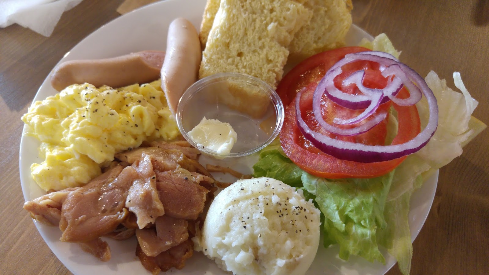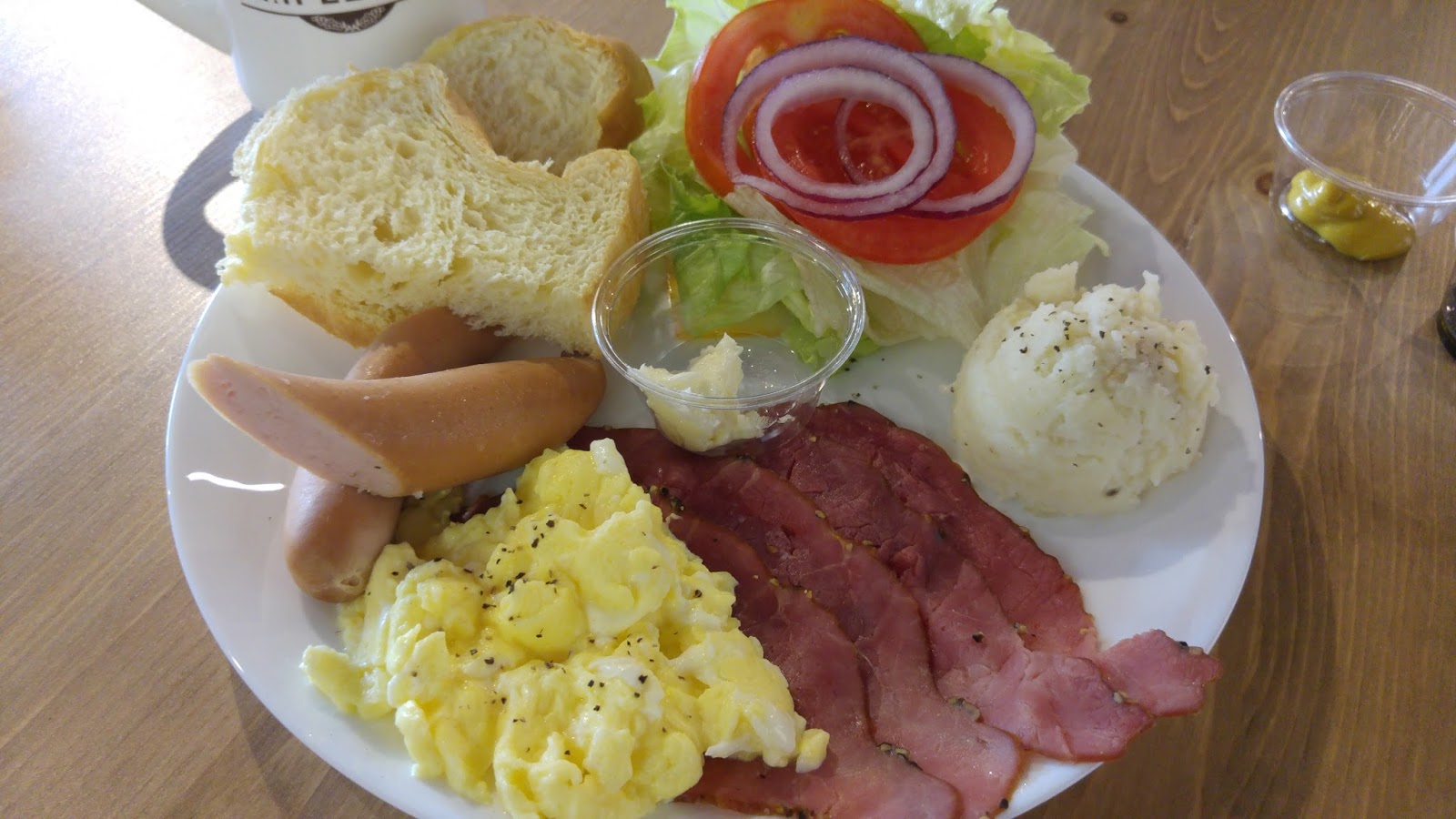 ▲煙燻雞腿肉三明治,搭配的是布理歐面包、水煮馬玲薯、美式炒蛋、德式香腸,美生菜
