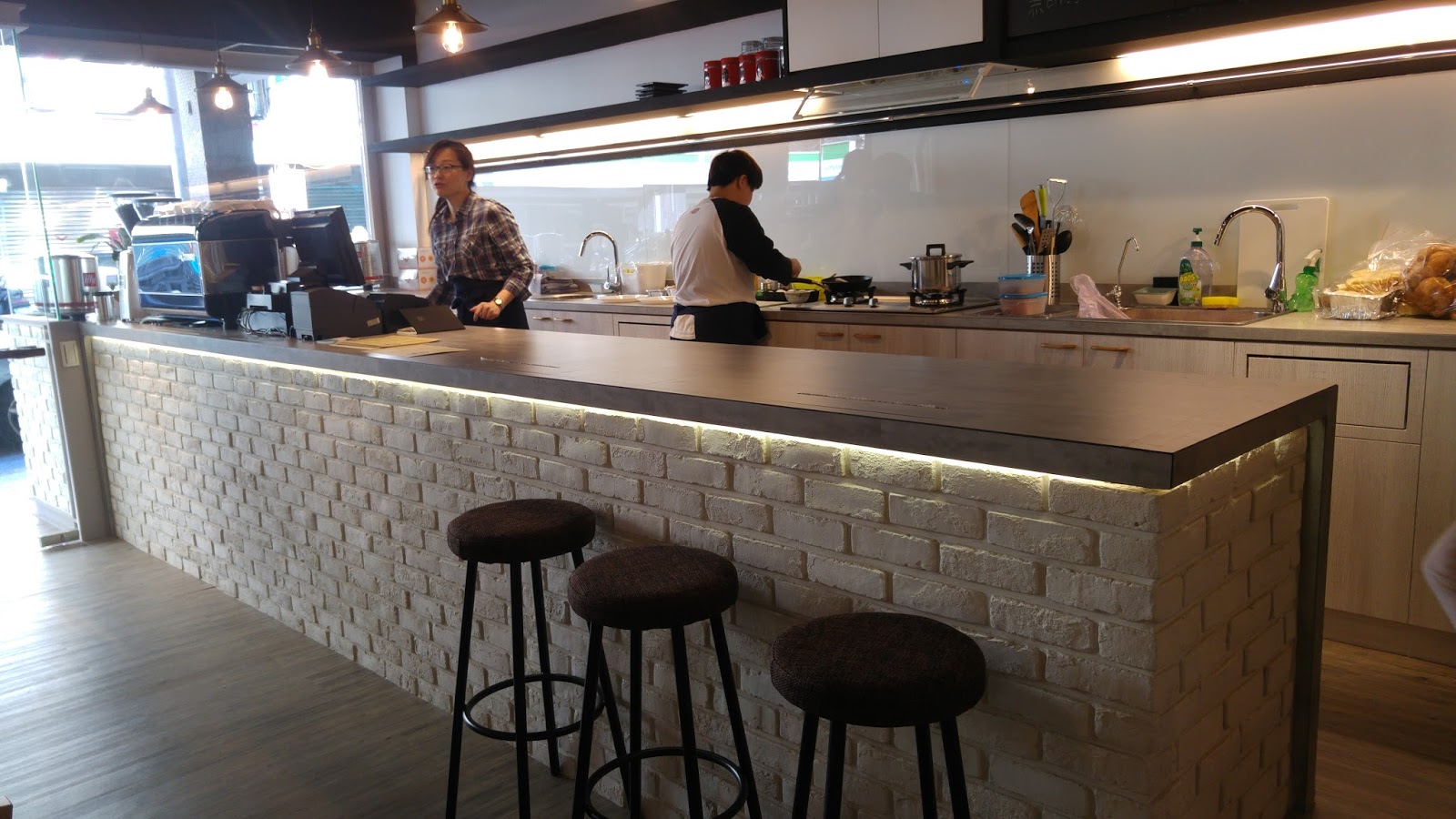▲吧枱用文化石包裝,讓整個吧枱更有質感,吧枱前安排了坐位,讓咖啡與人可以更貼近些.